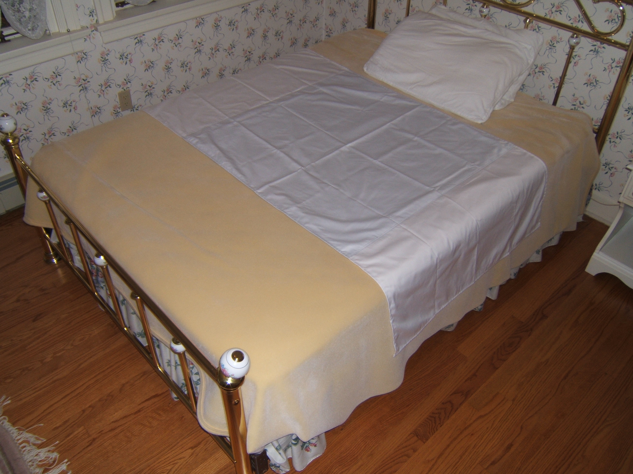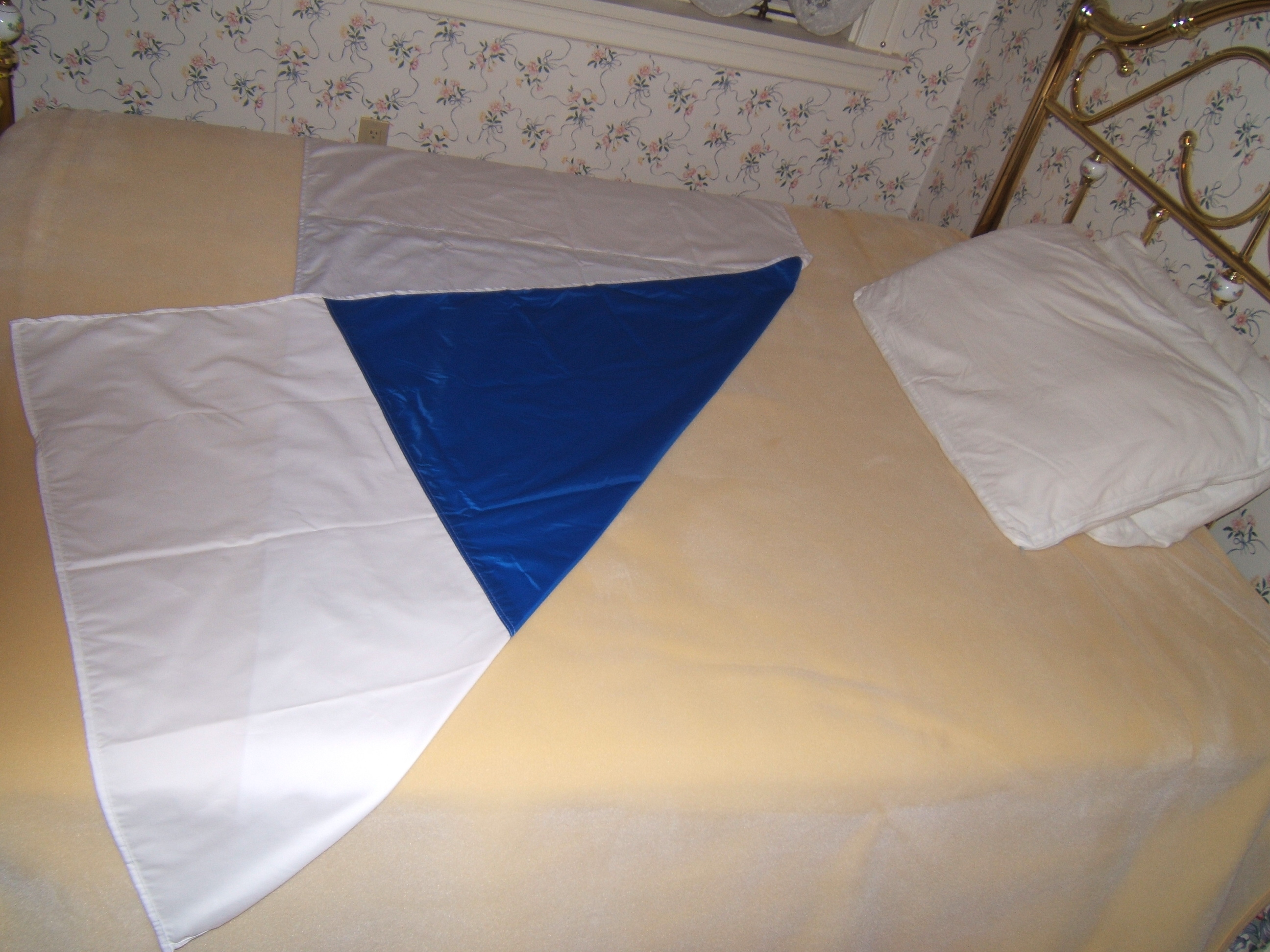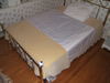 The Lateral Transfer Sheet is comprised of two panels of fabric, one slippery blue nylon panel centered and sewn on a larger white cotton/polyester panel. When positioned correctly, the blue panel should be face down on the mattress with the white sides of the sheet tucked in. An incontinent pad should be placed under the client as needed. When the client needs to be transferred to a stretcher or repositioned in bed, simply un-tuck, grasp and pull the white sides to slide the client to the desired location being careful to follow your institution's transferring/repositioning procedures.